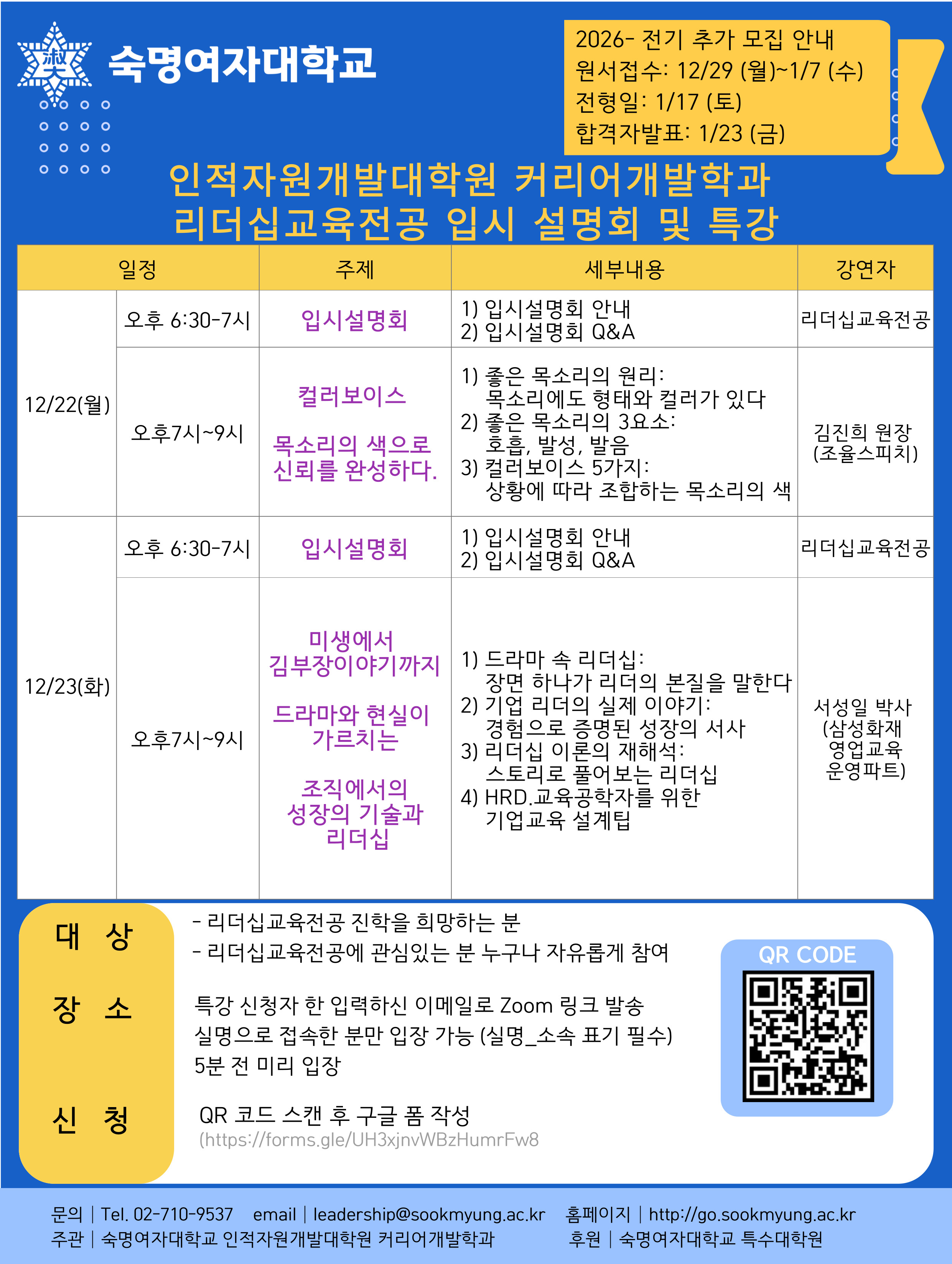 숙명여자대학교 인적자원개발대학원 커리어개발학과 리더십교육전공에서 입시 설명회 및 특강을 진행합니다.